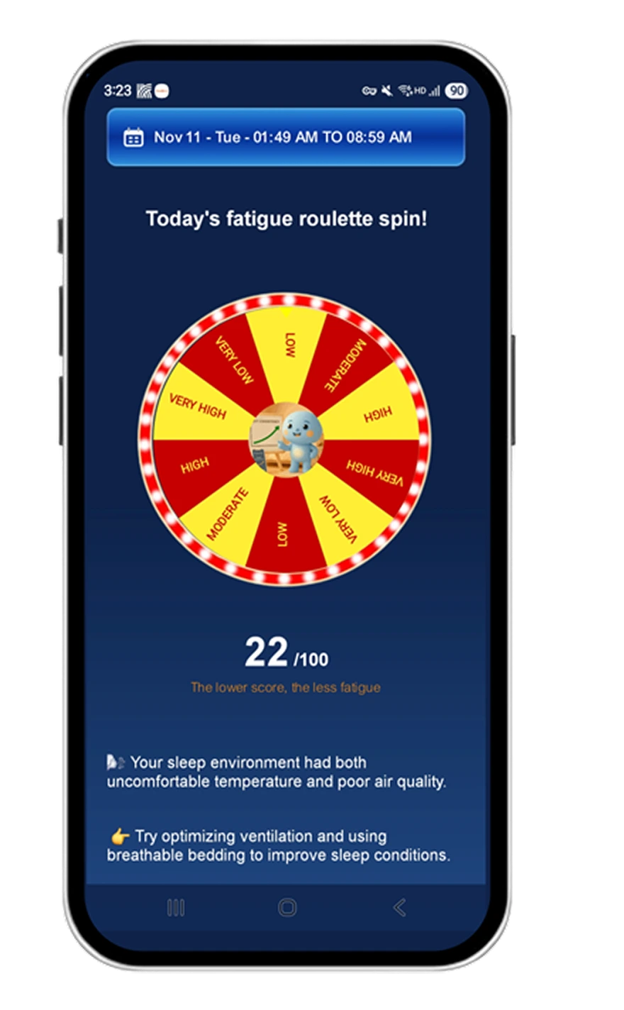 Our AI analyzes your total sleep time, movement, and sleep onset latency to predict your fatigue level and deliver personalized insights — automatically, every morning. No manual tracking. No setup. Just smarter sleep.